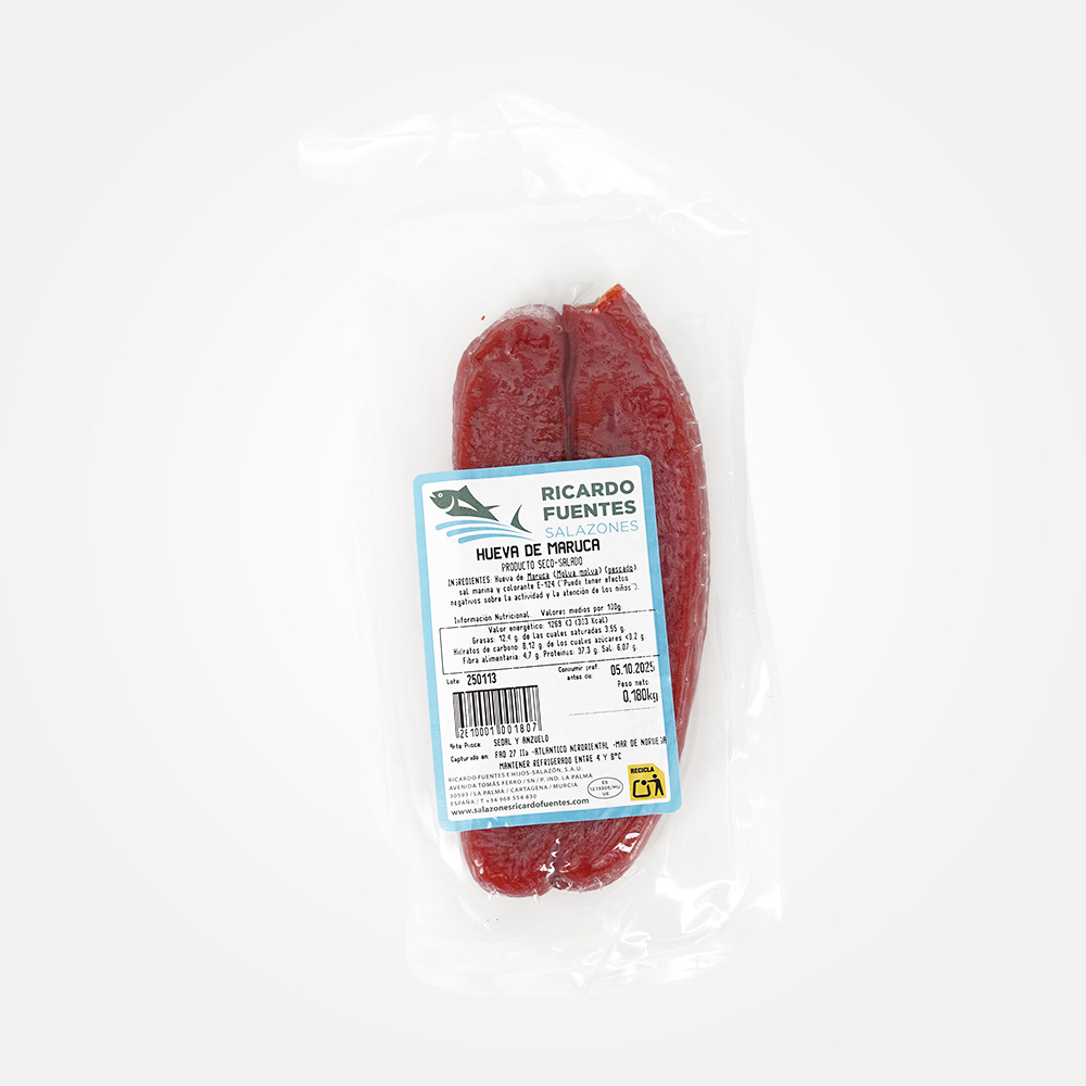 Procedente de la maruca, un pez típico del océano Atlántico, esta hueva destaca por su textura carnosa y su sabor intenso y particular. El proceso de secado es completamente artesanal, respetando la tradición para conservar todo su carácter.